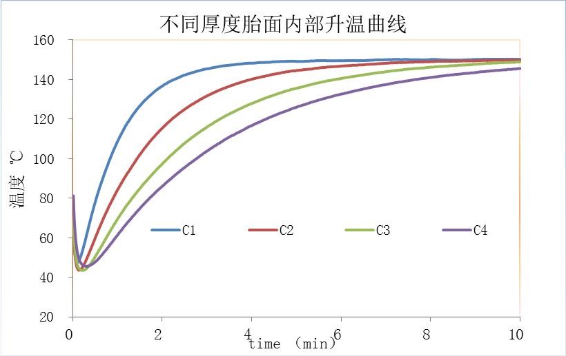 試樣(實(shí)際某公司的胎面)按照標(biāo)準(zhǔn)裁取并送入模內(nèi)進(jìn)行硫化升溫,得到以下升溫曲線